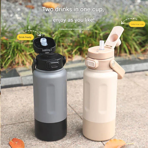 Chupa ya michezo ya chuma cha pua yenye mpini ina kofia ya spout na kofia ya mpini ili kuhakikisha muhuri usiovuja. Kofia zote mbili zina vipini vya kubeba kwa urahisi.