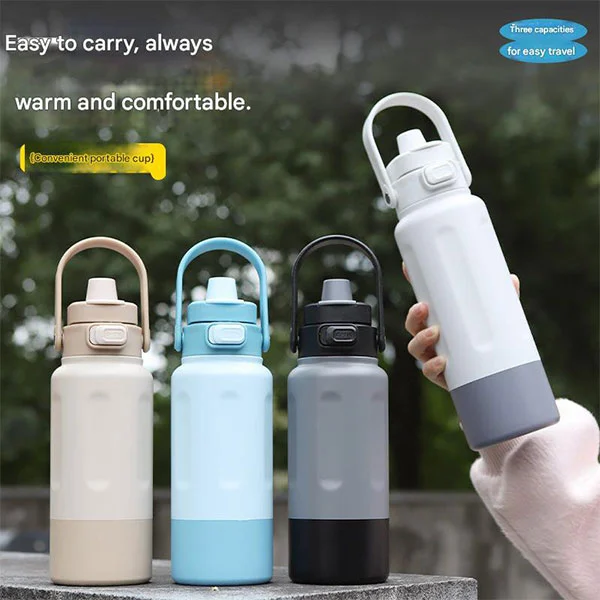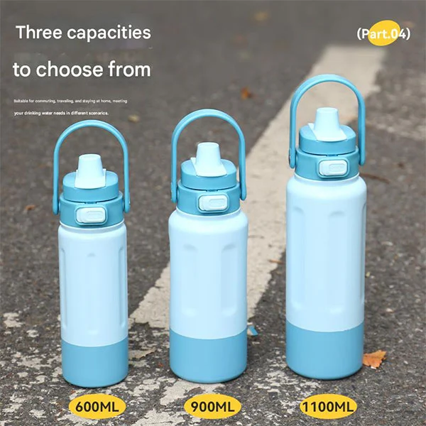 Chupa hii ya michezo ya chuma cha pua ya 600ml/900ml/1000ml yenye mpini ina muundo wa insulation ya utupu yenye kuta mbili, inayoweka vinywaji vyenye moto kwa saa 12 na baridi kwa saa 24.