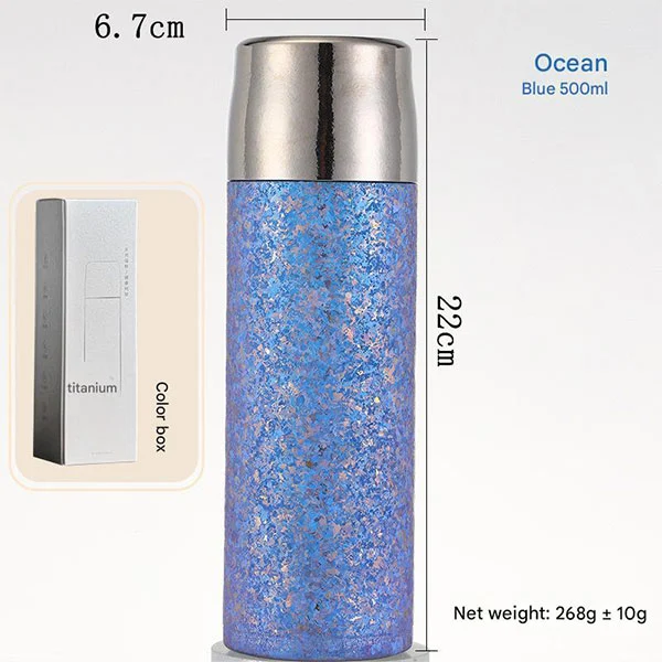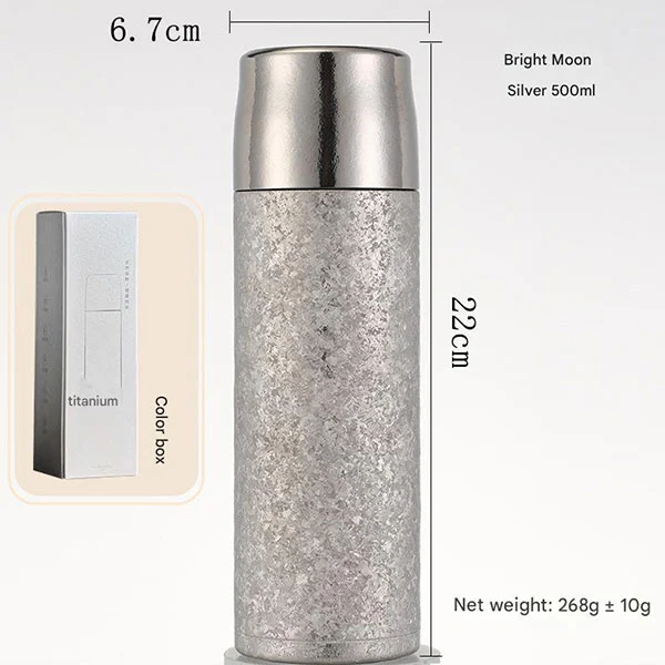 Chupa za Maji ya Titanium hupitisha muundo wa insulation ya utupu wa safu mbili. Chupa zetu za maji za chuma zimethibitishwa kutoa insulation bora kwa vinywaji vyako, iwe ni cola iliyopozwa au kahawa moto. Vinywaji vya moto vinaweza kuwekwa joto kwa hadi saa 8, wakati vinywaji baridi vinaweza kuwekwa joto kwa hadi saa 12. (Data ya majaribio: Uhamishaji joto: Ongeza maji kwenye joto la kawaida la 99 ° C, na joto litazidi 60 ° C baada ya saa 6 za insulation; Jokofu: Ongeza maji kwenye joto la kawaida la 0 ° C, na joto litakuwa chini ya 5 ° C baada ya saa 6 za insulation.)