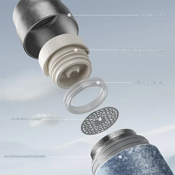 Kitengenezaji cha kawaida cha chai, chupa ya Titanium ina kikombe kisichoweza kuvuja kilichotengenezwa kwa titani safi ndani na nje, kilicho na vifuniko visivyovuja, vifuniko vya vikombe vya titani na vya kuzuia kuwaka kwa safu mbili!